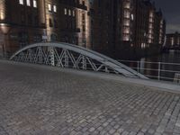 A top-down view of Hamburg's Speicherstadt, Germany's largest warehouse district. Classic architecture, cobblestone streets, and elevated roadways along picturesque canals. The iron guard rails and handrails stand out against the dark night sky, illuminated by street lights. An iconic European metropolitan area.