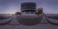 A nighttime view of the HafenCity district in Hamburg, Germany. The city skyline is reflected in the water, creating a stunning visual effect. The circular object in the sky adds an intriguing element to the urban landscape.
