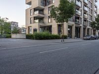 A dawn scene in Hamburg's HafenCity neighborhood showcases modern architecture and urban living. Residential apartment buildings line the road, with trees providing a green touch. A perfect blend of Europe's charm and contemporary design.