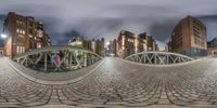 a 360 - ray view of buildings and street lights from a bridge over a cobblestone road
