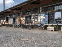 This is an image of an outdoor area in Hamburg, Germany. The cobblestone road surface is filled with people walking their bicycles and enjoying the city life. The classic architecture of the buildings surrounding the courtyard reflects the rich history of the city. In the background, an industrial warehouse and loading dock can be seen, adding an urban and gritty feel to the scene. The graffiti wall adds a touch of art to the district. This photo captures the unique urban design and vibrant atmosphere of Hamburg's art district.