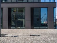 A modern architecture building in the city of Hamburg, Germany. The facade features large glass windows and composite material. The building is located in a bustling business district, surrounded by urban design and city life.