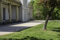 a man in white shirt next to tree and building area on grass covered area next to walkway