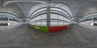 there is a mirror of a plane hangar on the ceiling and a red, white and green sign pointing to a red one way