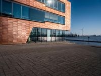 This image captures the modern architecture of a waterfront area in Hamburg, Germany. The open space provides a clear view of the pier and harbor, with a cloud-filled sky above. Contrails from passing airplanes add to the dynamic atmosphere. The jetty and landing area showcase the city's connection to Europe and its bustling harbor. This photo represents a typical day in Hamburg, where the combination of modern architecture and natural elements create a unique and vibrant atmosphere.