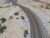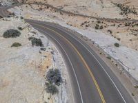 Aerial view of rural Utah landscape with an asphalt road cutting through. Cloudy day showcases the high position of the road. Elevated perspective captures the beauty of Head of the Rocks in Escalante, USA.