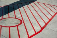 A high aerial view of the open spaces in Los Angeles, California. The patterned lines of the roads and the rectangular shapes of the buildings create an interesting composition. The red stadium and the circular tables add vibrant pops of color to the concrete surface.