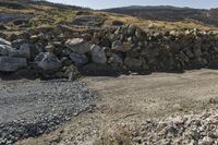 there is a bike rider on a paved dirt road through rocky area near a mountain