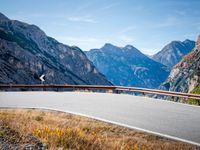 A high mountain road in Italy with stunning views of the landscape. The road twists and turns, offering breathtaking overlooks and panoramic views. Clouds create contrast against the clear blue sky. Armco barriers line the road for safety. A perfect day to explore the European countryside.
