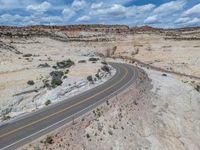 High position aerial view of an asphalt road in rural Utah. The landscape features stunning natural formations such as Head of the Rocks. Clouds dot the clear day sky, creating a picturesque scene.