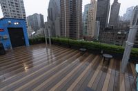 This image captures the breathtaking cityscape of New York City, USA. The photograph showcases the iconic skyline with towering skyscrapers and high-rise condominiums. The urban landscape features a mix of architecture, including apartment buildings and downtown offices. The photo also highlights a spacious open space with a walkway and deck, providing a relaxing area amidst the bustling metropolitan area. The clear sky and cloud formations create a beautiful backdrop for the wooden flooring and roof of the buildings. This image perfectly captures the essence and beauty of New York City's urban architecture.