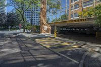 A modern high-rise building in Toronto, Ontario. The glass walls and open spaces reflect the clear sky. The surrounding road, crosswalks, and parking areas create a bustling urban landscape.