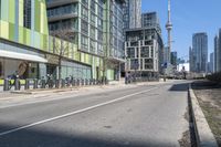 This image depicts the modern architecture and cityscape of Toronto, Canada. The clear sky creates a perfect backdrop for the high-rise condominiums, skyscrapers, and towers that dominate the city skyline. The residential neighborhoods and tree-lined streets can be seen below. The road surfaces and thoroughfares are lined with street lights, providing a vibrant urban atmosphere. Bicycles are a popular mode of transport in this bustling city. This photo captures the essence of urban design and city life in Toronto, Ontario.