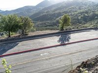 Aerial view of a high road in California, USA. The asphalt road winds through the scenic mountain landscape, with Armco barriers for safety. Sunny day provides ideal weather for recreational activities and enjoying the breathtaking nature.