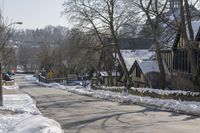 A suburban neighborhood in Toronto, Canada, with classic architecture houses lining the high road. The clear sky highlights the autumn colors of the trees. Snow covers the elevated slope, creating a picturesque winter scene.
