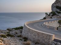 An elevated road along the coastal landscape of Mallorca, Spain. The clear sky creates a stunning backdrop for a dawn drive. Guard rails and Armco barriers ensure safety along the high road with breathtaking views of the ocean and mountains.