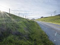 A sunny day in rural California, with a lush landscape of green grass and vegetation. The asphalt road winds through the highland hills, lined with fields and overhead power lines. Contrails streak across the clear blue sky, adding to the natural beauty.