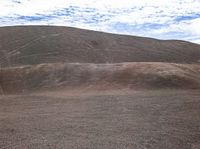 A scenic landscape with a cloud-filled sky and a winding road through the highland mountains. The road surface transitions from dirt to gravel, adding to the natural beauty of the track. Open spaces and grassy surfaces complement the rugged terrain.
