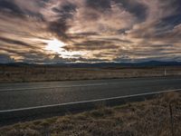a road stretches into the sunset and some clouds above it, along with an empty highway running through grass, and tall, dry grass