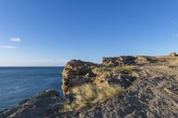 A breathtaking coastal landscape with a clear sky and azure ocean. The rugged highland terrain is adorned with rocky outcrops and cliffs. The rock surfaces and gravel formations create an open space surrounded by water.
