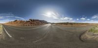 A straight section of Highway 12 in Capitol Reef, Utah. The road stretches into the distance, lined with beautiful desert landscape on both sides. Clear skies and fluffy clouds accentuate the natural beauty of the USA.