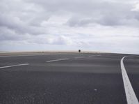 A picturesque highway stretches along the coastal landscape of Fuerteventura, Spain. The road, lined with asphalt and surrounded by nature, leads to the horizon where the ocean meets the grey sky. With clouds hovering above and a desert-like terrain on one side, the low-lying road surface curves gently, providing a scenic drive for motorists. This image captures the beauty of the European landscape and the impressive infrastructure that connects the picturesque regions of Spain.
