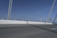 A view of a highway bridge on a clear day, with azure sky and contrails overhead. The road is made of asphalt and concrete, with black and grey lines marking the lanes. The bridge is composed of metal and stands tall against the horizon. In the foreground, there are poles parallel to the road. The image captures the motion blur of the vehicles on the road. The overall composition represents the modern infrastructure and engineering prowess.