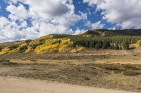 A road winds through a picturesque landscape of rolling hills and dense forests, adorned with golden fall leaves. A lone horse rider traverses the rugged terrain under a clear sky with wisps of clouds.