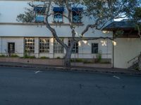 A tree-lined street in the USA with historic architecture. Clear sky casts hard shadows on the buildings and storefronts. The apartment with the 'albero' sign stands out among the shops on the road.