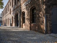 A view of a historic brick alleyway in Berlin, Germany. The classic architecture, cobblestone road, and brick walls create a charming and picturesque scene. The shadows cast by the buildings add depth and character to the image.
