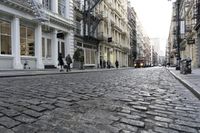 A bustling street in the heart of New York City. Cobblestone road lined with historic buildings and shops. Incidental people add to the energy of the scene. New York City's iconic architecture on display.