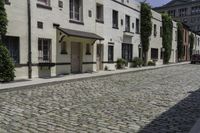 An old cobblestone road in the heart of New York City. Historic buildings with charming windows and urban design line the street. Lush vegetation adds a touch of green to the cityscape.
