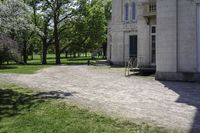 a bike parked in front of an old mansion building on the grass in front of it is an empty path