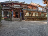 A charming alley-way in the historic town of Lijiang, China. Classic architecture with cobblestone roads and traditional Chinese houses. Clear skies and low buildings create a peaceful suburban atmosphere.