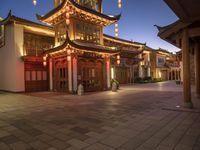 a pagoda sits outside in a building lit up at night and lit up with lanterns