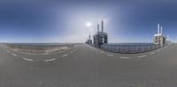 A contemporary view of Holland's modern architecture and urban design. The coastal landscape offers a clear sky and a breathtaking horizon. An industrial area showcases the country's infrastructure and power stations. A man riding a skateboard adds an unexpected touch to the scene.