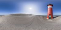 a 360 camera fish eye view of a lighthouse on the beach by a large field