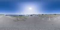 Boats parked along a street in Holland, with a clear blue sky serving as the backdrop. The coastal landscape and open space create a serene atmosphere. A perfect day to explore the Netherlands by boat.
