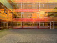 This image showcases the colorful courtyard area of a modern office building in Holland, Netherlands. The open space features multicolored reflective windows and glass walls, creating a vibrant and inviting atmosphere. The architecture represents the modern design found in the business districts of European cities. The courtyard is paved with orange brick and gravel, giving it a unique and stylish appearance. This photo captures a sunny day in Holland, highlighting the modern architecture and commercial atmosphere of the business district.