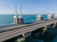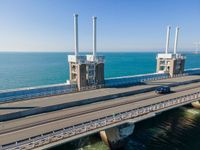 This is an aerial view of a large bridge in the Netherlands, located on the coastline. The modern architecture of the bridge and the clear sky create a striking contrast against the coastal landscape. Two vehicles can be seen driving across the elevated bridge, with wind turbines in the background. This photo represents the unique combination of nature, water resources, and modern infrastructure in Holland. It showcases the high level of design and engineering in the country's road and bridge systems. The image provides a panoramic view of the ocean and the horizon.