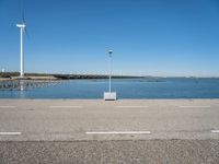 This image captures a scenic view of a pier in Holland, Netherlands. The clear sky and calm, blue water create a tranquil atmosphere. At the end of the pier, a street light and a wind turbine can be seen. Boats are docked along the shore, adding to the coastal charm. This picturesque landscape showcases the natural beauty of the Netherlands's coastline. With the windmill in the distance, it's a perfect representation of the country's iconic scenery. Experience the serene and breathtaking views of Holland's pier and water.