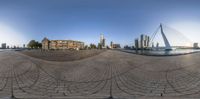 A panoramic view of a city in the Netherlands, with modern high-rise buildings and skyscrapers reflected in the calm waters of a lake. The cityscape showcases the urban design and architecture of Holland, with a clear sky and artificial light illuminating the night.