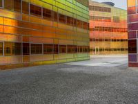 an abstractly colored building surrounded by a parking lot on asphalt, taken from the street