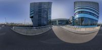 Modern architecture in the business district of Holland, Netherlands. The office building reflects on the pavement of the curved road. Open space and straight down the road design enhance the urban feel.