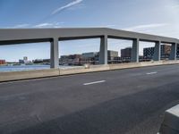 an empty city highway with a bridge and a few buildings in the background on a sunny day