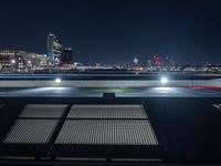 An atmospheric night view of a modern city in the Netherlands. The cityscape is illuminated by artificial street lights, highlighting the unique architecture and skyline. The metropolis comes alive under a dark European sky.
