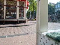 This image showcases the lively city of Amsterdam, in the Netherlands. The photo captures a classic architecture scene, with a bike parked on the street surrounded by shops and parked bikes. Behind a glass door, a cafe is seen, symbolizing the city life and urban design of Amsterdam. This photo represents the vibrant and dynamic atmosphere of the city, with its beautiful architecture, bustling streets, and charming storefronts.