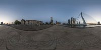 A stunning aerial view of a modern skyscraper in Holland, overlooking a river and cable-stayed bridge. The cityscape is illuminated by the afterglow of dawn, creating a beautiful contrast between the dark water and the azure sky.