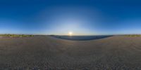 A breathtaking view of the sunrise in Holland, casting a warm glow over the coastal beach. The sun creates a beautiful circle of light on the sandy shore. A serene and calm start to the day.