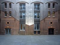 This image showcases a very big building in Holland, Netherlands. The classic architecture of the building is complemented by the interesting window design and the brickwork of the wall. Stairs lead up to the entrance door, adding to the grandeur of the facade. The building is located in the heart of the city, surrounded by urban open spaces and bustling city life. It is an example of the industrial architecture prevalent in Europe. The photo captures the vibrant energy of the city, with pedestrians walking on the road surface and the constant movement of people in the courtyard. This is a true reflection of urban design in Holland.